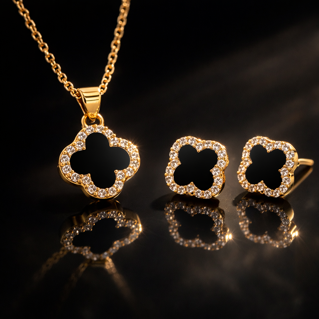 Add timeless elegance to your jewelry collection with this beautiful black clover necklace and earrings set. Designed with a luxurious four-leaf clover motif, this set features a deep black center stone surrounded by brilliant crystal detailing and finished with a premium gold plating.