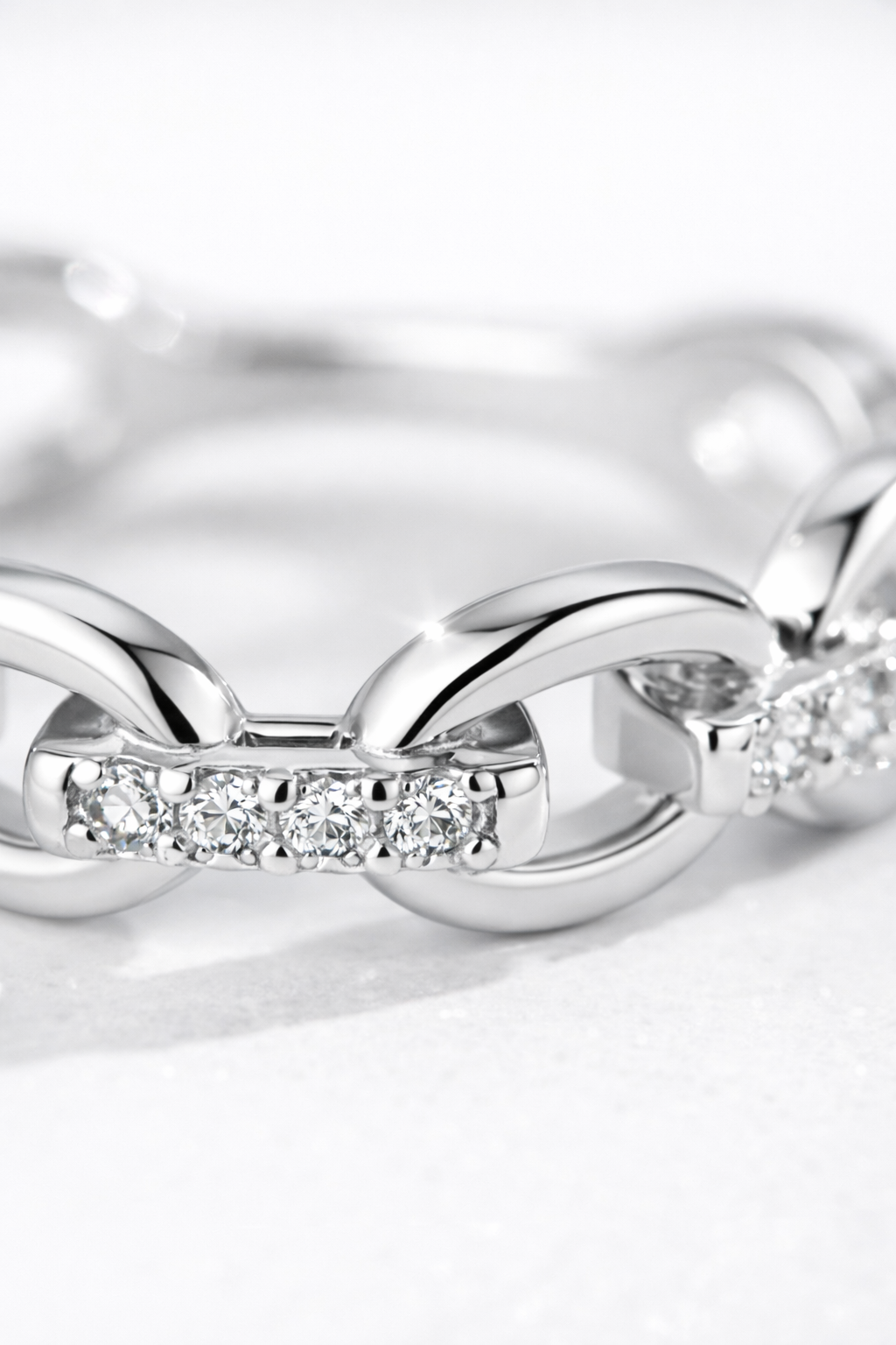 The design features interlocking chain links symbolizing connection, strength, and unity. Two of the links are embellished with high-sparkle cubic zirconia stones, adding a touch of refined glamour without overpowering the sleek silhouette.