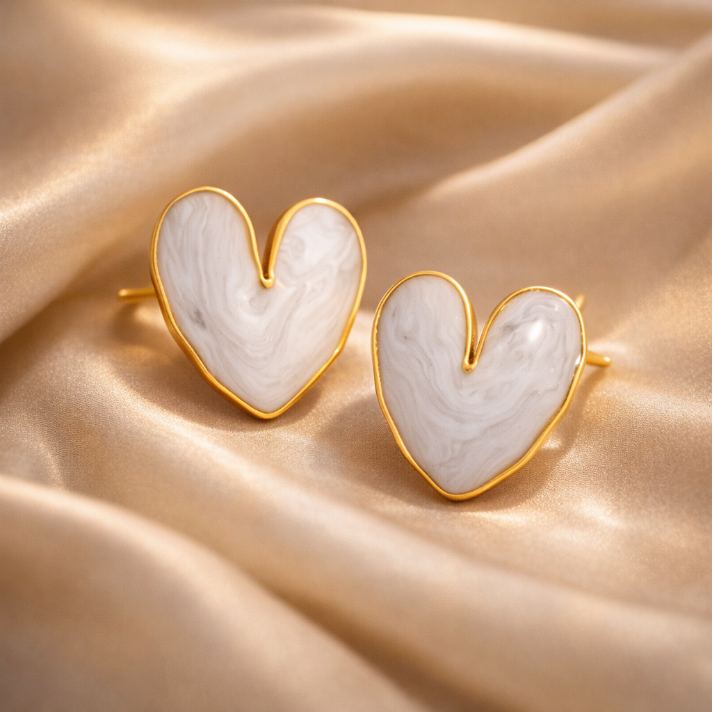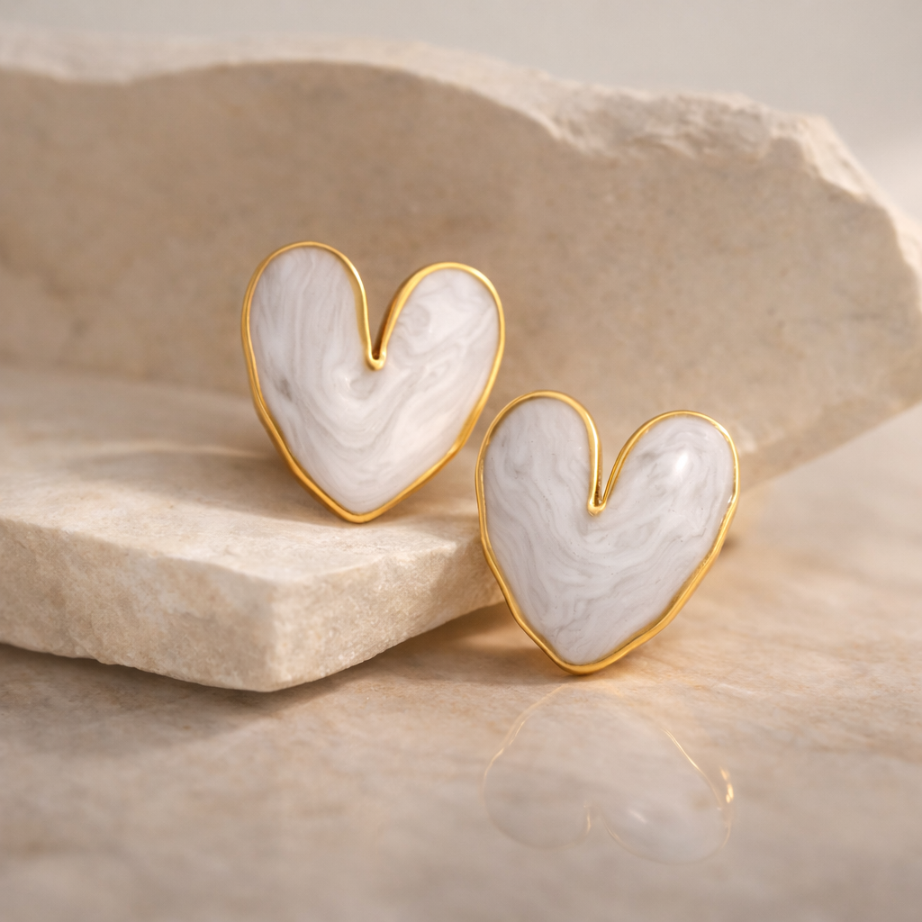 White Heart Stud Earrings – Gold Plated Minimalist Marble Heart Earrings for Women | Pavani Studio